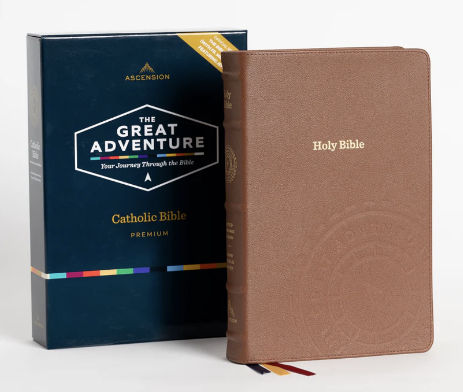 An elegant Bible made out of the highest-quality materials, this version features a beautiful brown goatskin leather cover with calfskin liner, perimeter stitching, edge-lined binding, raised spine hubs, and gilt edges. It transforms the life-changing features of The Great Adventure Catholic Bible into a treasured biblical experience that makes the beauty of the Word of God tangible.