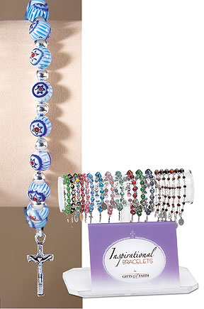 7" L stretch. Purchase of 24 Rosary Bracelets includes a FREE display! -- Glass/Silver or Gold Plate